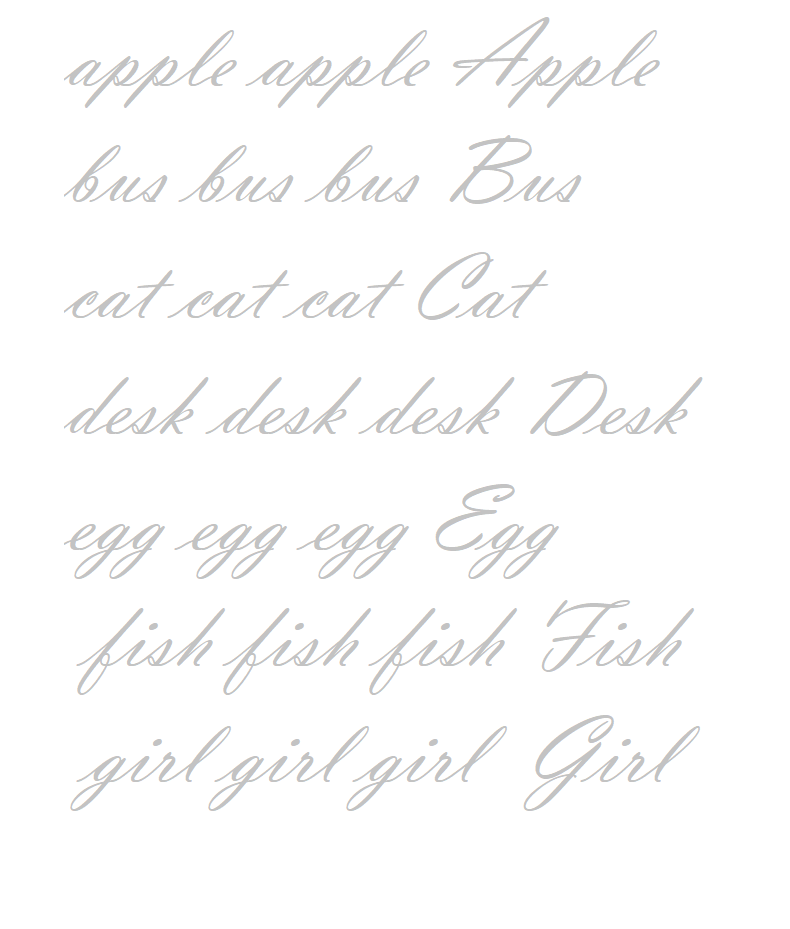 apple, bus, cat, desk, egg, fish, girl 영어필기체 연습자료입니다.