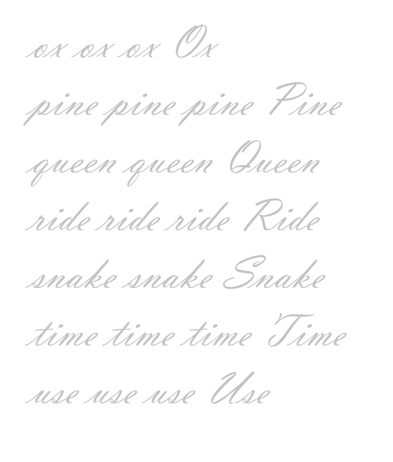 ox, pine, queen, ride, snake, time, use 영어 필기체 연습지입니다.