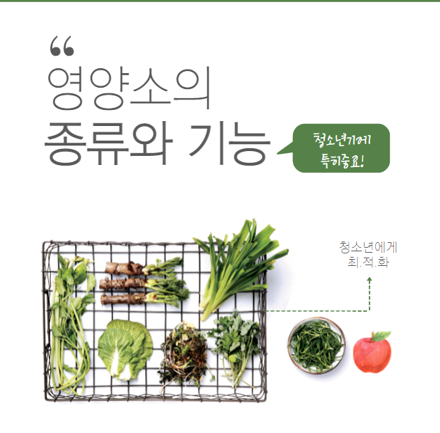 청소년기는 몸의 성장이 급격해 지는 시기로, 균형잡힌 식사와 영양소를 골고루 섭취하는게 매우 중요한 시기입니다. 따라 충분한 영양소 공급과 균형잡힌 건강 식생활을 실천해야합니다.