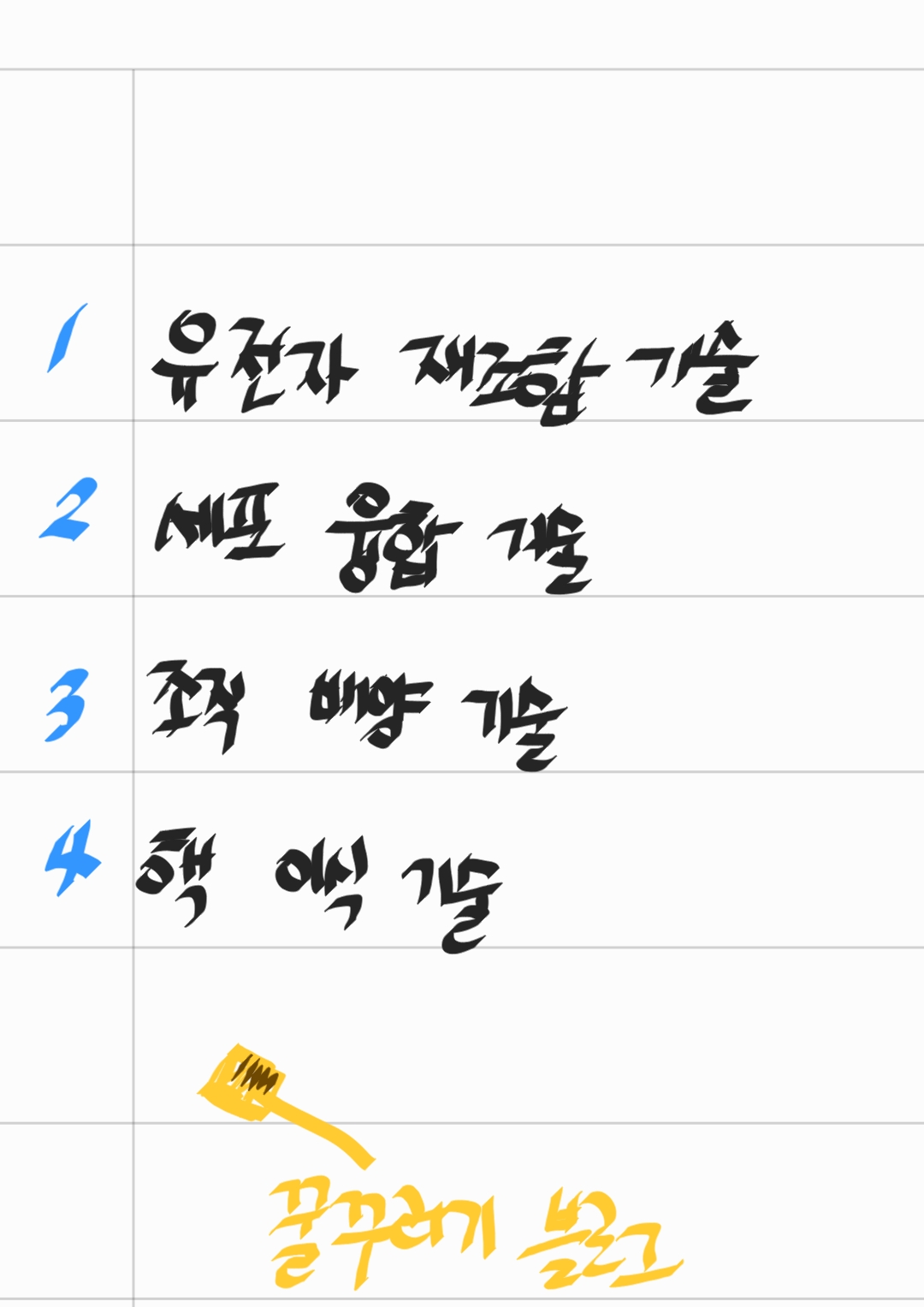| 세포융합기술 | 서로다른 두 세포를 융합하여 우수한 성질을 갖는 생명체를 만드는 기술 특징:세포융합으로 만들어진 생명체는 다음세대로 유전되지 않음. 각각의 우수한 성질을 모두지는 생명체탄생 |