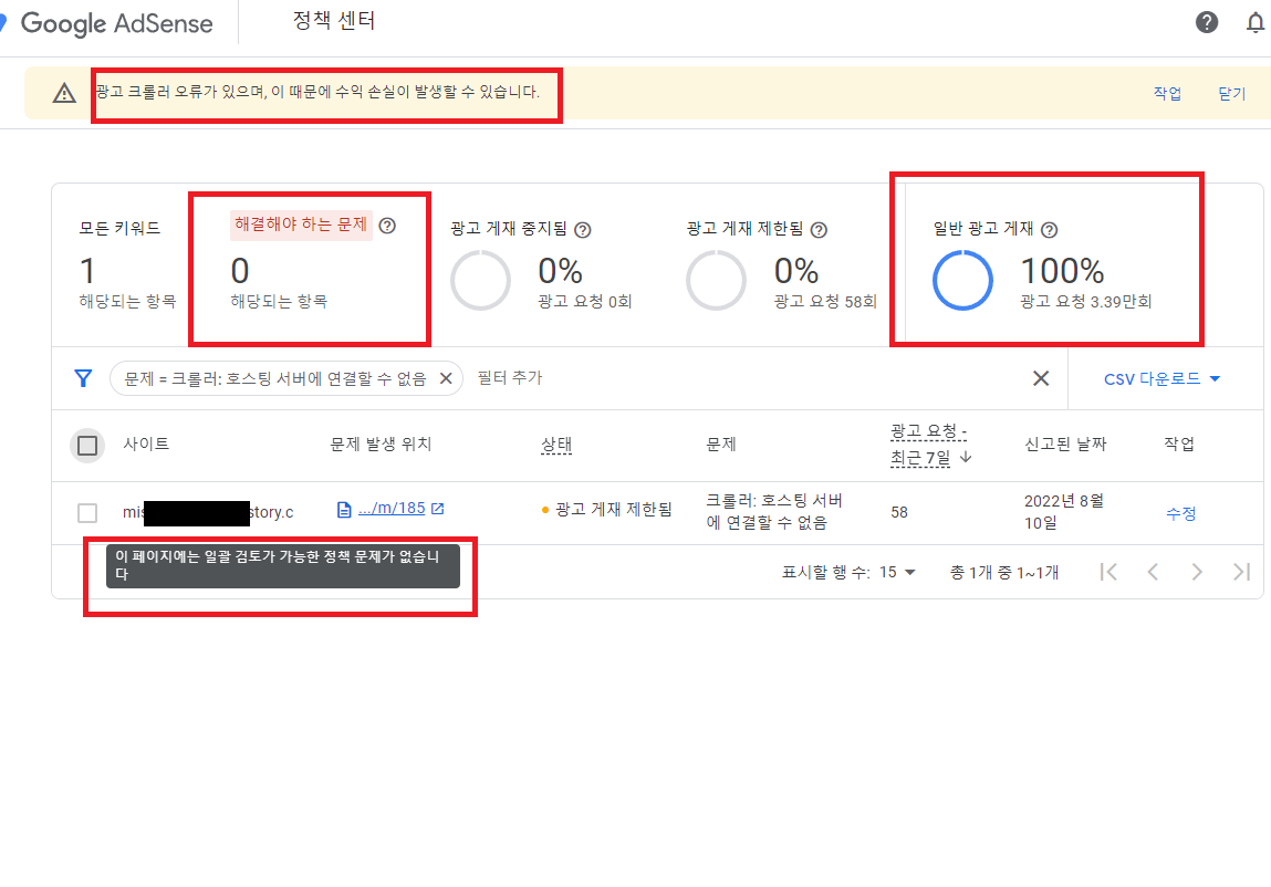 어차피 내 블로그에 게시될 캡처본인지만 본의아니게 주소를 가린 이유는 혹시나 마구 돌아다닐까봐 입니다. 광고 크롤러 오류가 생긴 뒤 그냥 둔 결과, 해결해야 할 문제가 없다고 나옵니다. 하지만 노란색바에는 아직도 오류문구가 뜹니다.