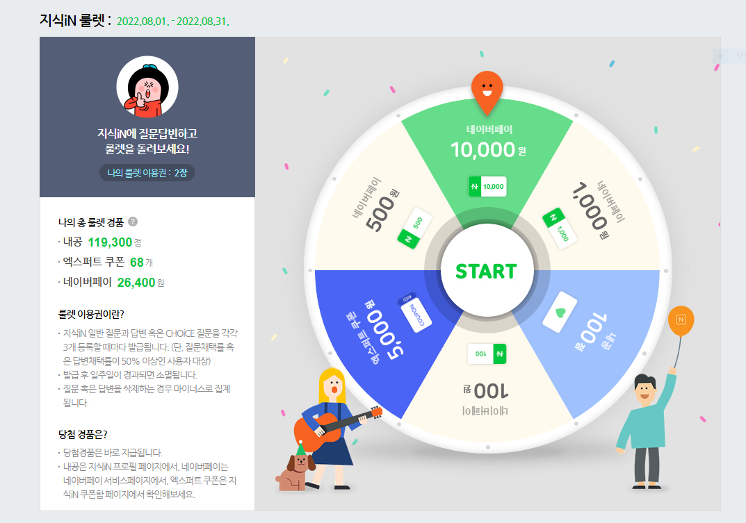 지식인룰렛은 거의 내공이 당첨되지만 가끔 네이버 페이가 당첨되기도 한답니다. 지식인 활동을 오래했는데 겨우 2만6천원정도 벌었습니다. 5천원짜리 한번 당첨되고 가끔 500, 100원이 당첨되는 지식인룰렛이랍니다. 지식인룰렛 확률은 월초가 더 좋고 월말은 내공만 나온다는 썰들이 있는데 경험상 거의 내공만 나오기 때문에 큰 의미는 없는 것 같습니다. 찾아보니 5만원 나오신 분 인증도 있더라는 .. 부럽...