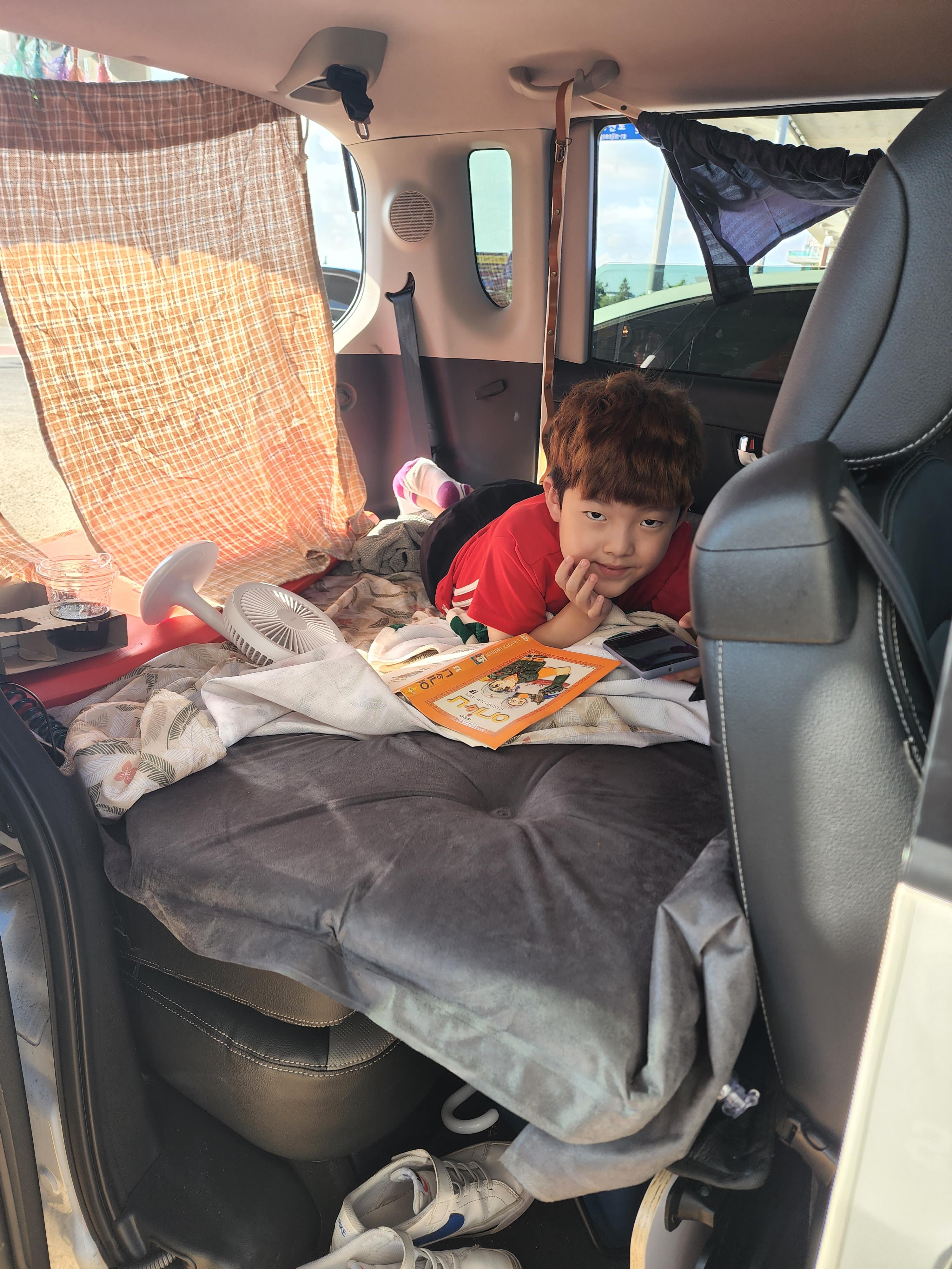 레이를 만난이후 주차장 조차 피크닉 장소로 만들어주는 마법이 시작됐답니다. 아이와 함께 차에 누워 숲이나 뷰 좋은곳에서 트렁크만 열어 차박텐트 없이 커튼만 로프로 묶어 주면 시원하게 차크닉 준비 완료랍니다.