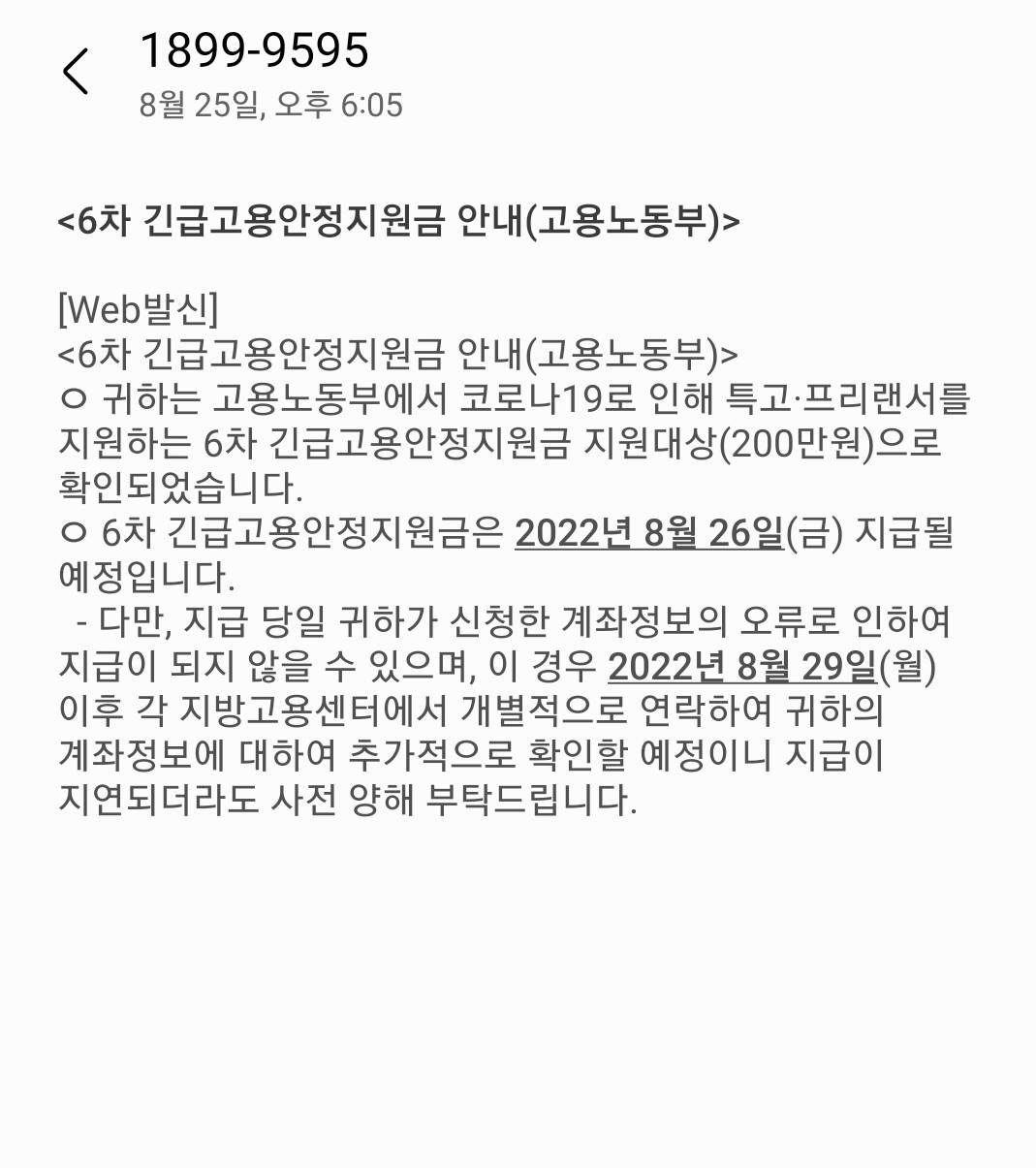 6차 긴급고용안정지원금은 1차~5차까지 지원하지 못했던 분들이 신규로 지원한 사업입니다. 긴급고용 안정지원금은 200만원으로 소득요건, 고용보험 가입등 까다롭게 심사 해 그 동안 한번도 지원금을 받지 못했던 분들께 나가는 지원금입니다. 6차 특고 프리랜서 지원대상은 2022년 8월 26일 지급이 확정 되어 입력된 계좌로 들어 올 예정이라고 합니다.