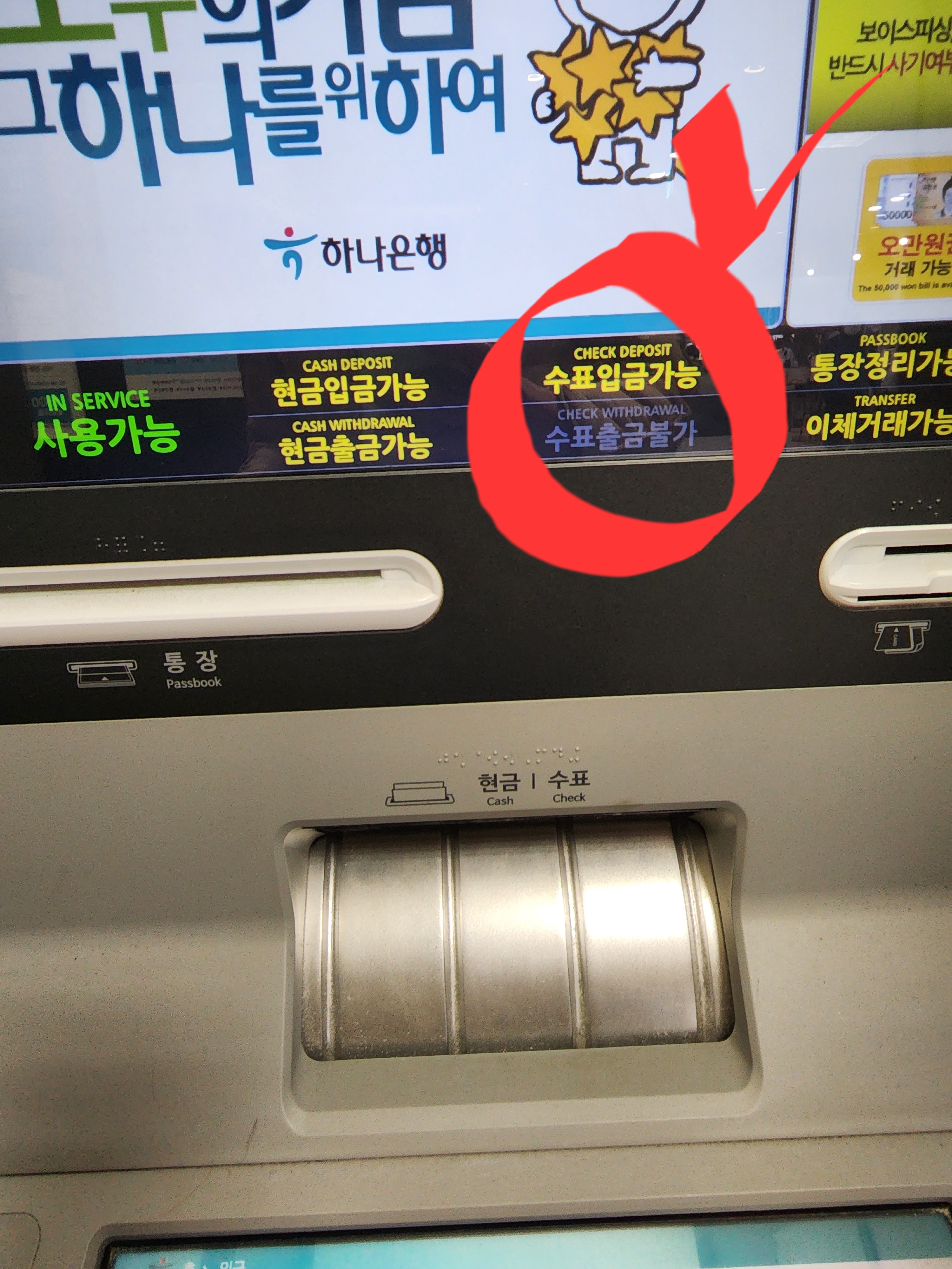 참고로 수표에 표시된 은행 상관없이 체크카드 하나만으로 타행 atm으로 입금이 가능합니다. 하지만 문제는 체크카드가 없다는것! 저의 주 거래 은행인 ㅎㄴ은행에 통장을 가지고 가봤습니다. (수표는 ㅇㄹ은행수표) 통장을 atm기계에 넣고, 수표입금을 시도해 봤는데 됩니다. 체크카드 없을 때 통장을 들고 atm 기계로 가셔서 입금하세요. 이걸 몰라서 주말내내 고생했다는.