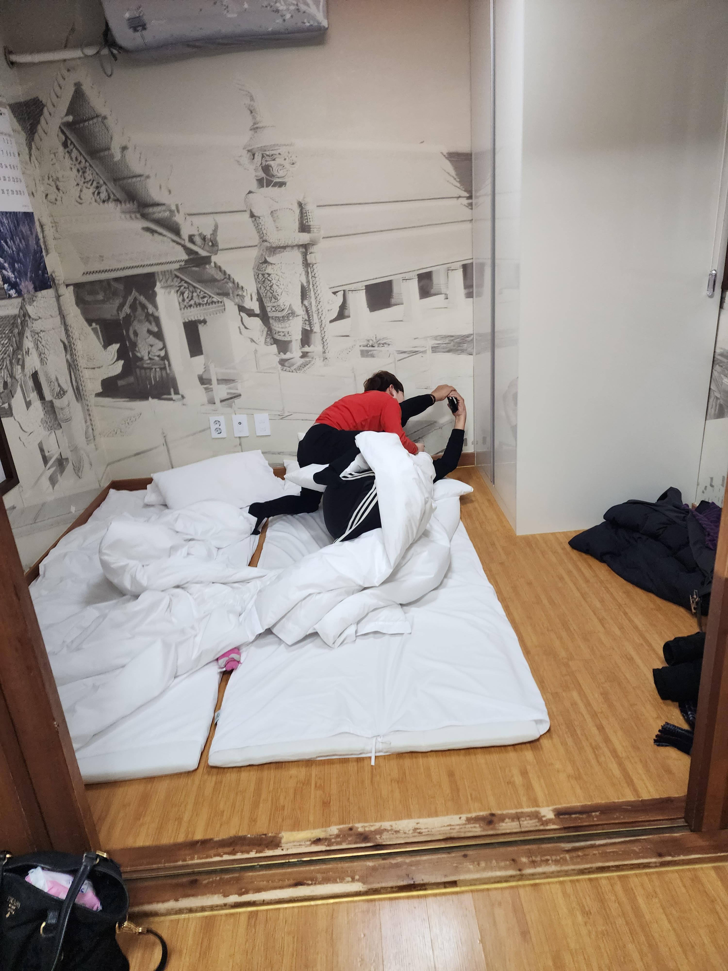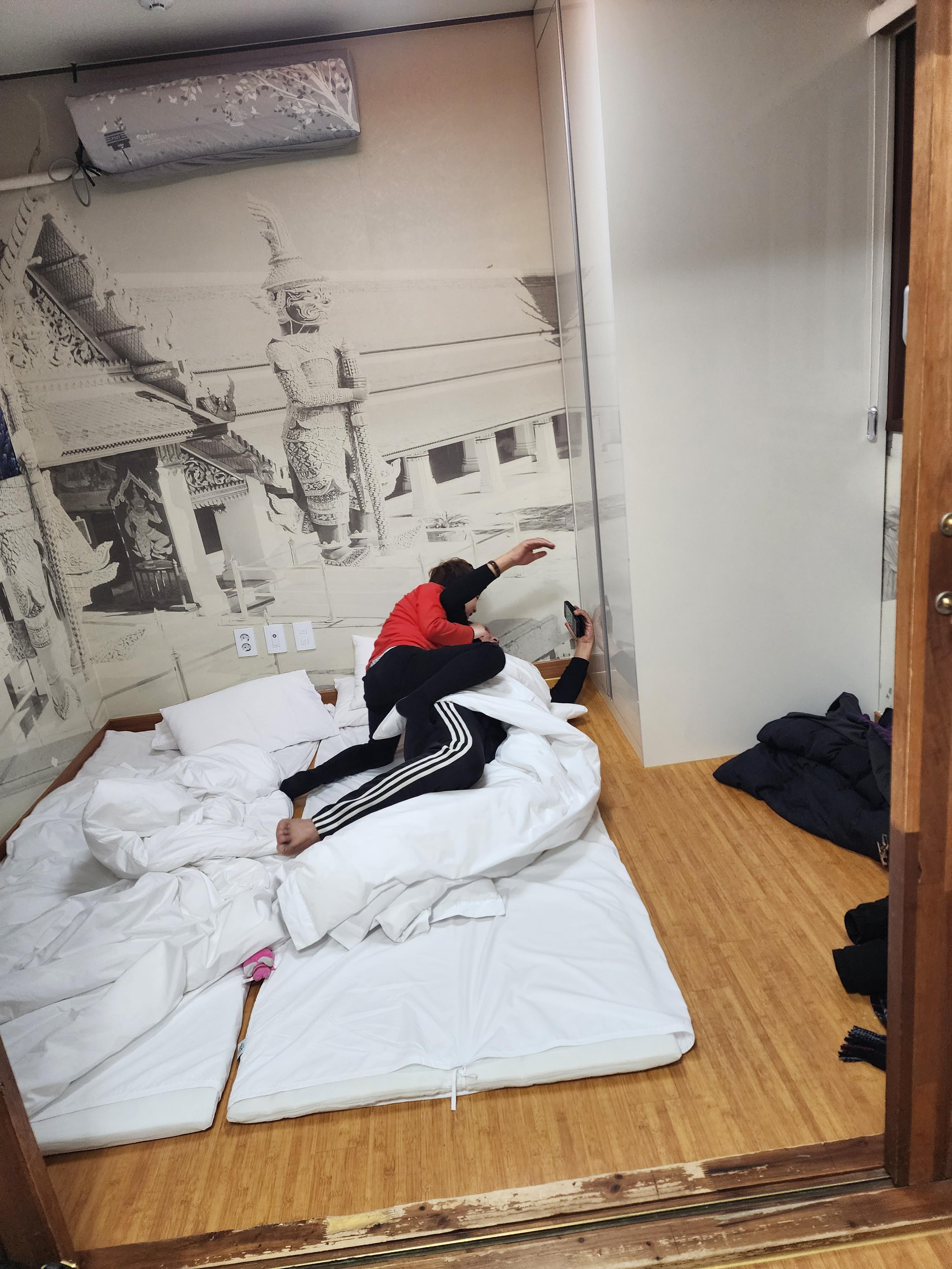 늦게 잘 사람은 문 닫고 놀 수 있는 환경이 아니라 모두가 함께 취침해야 하는 구조예요.
