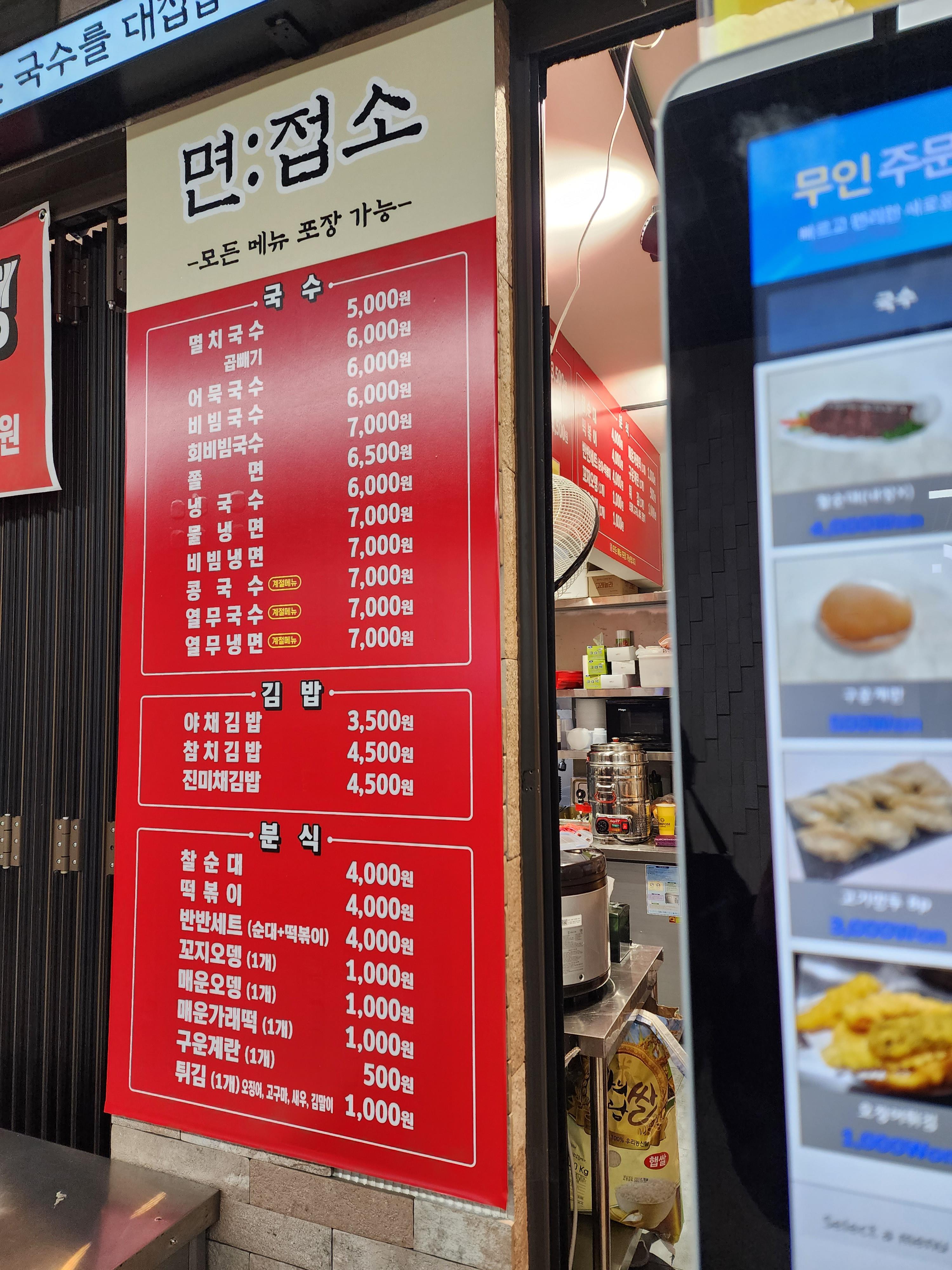 국수류와 김밥 그리고 간단한 튀김과 순대 떡볶이 등을 판매하고 있습니다.