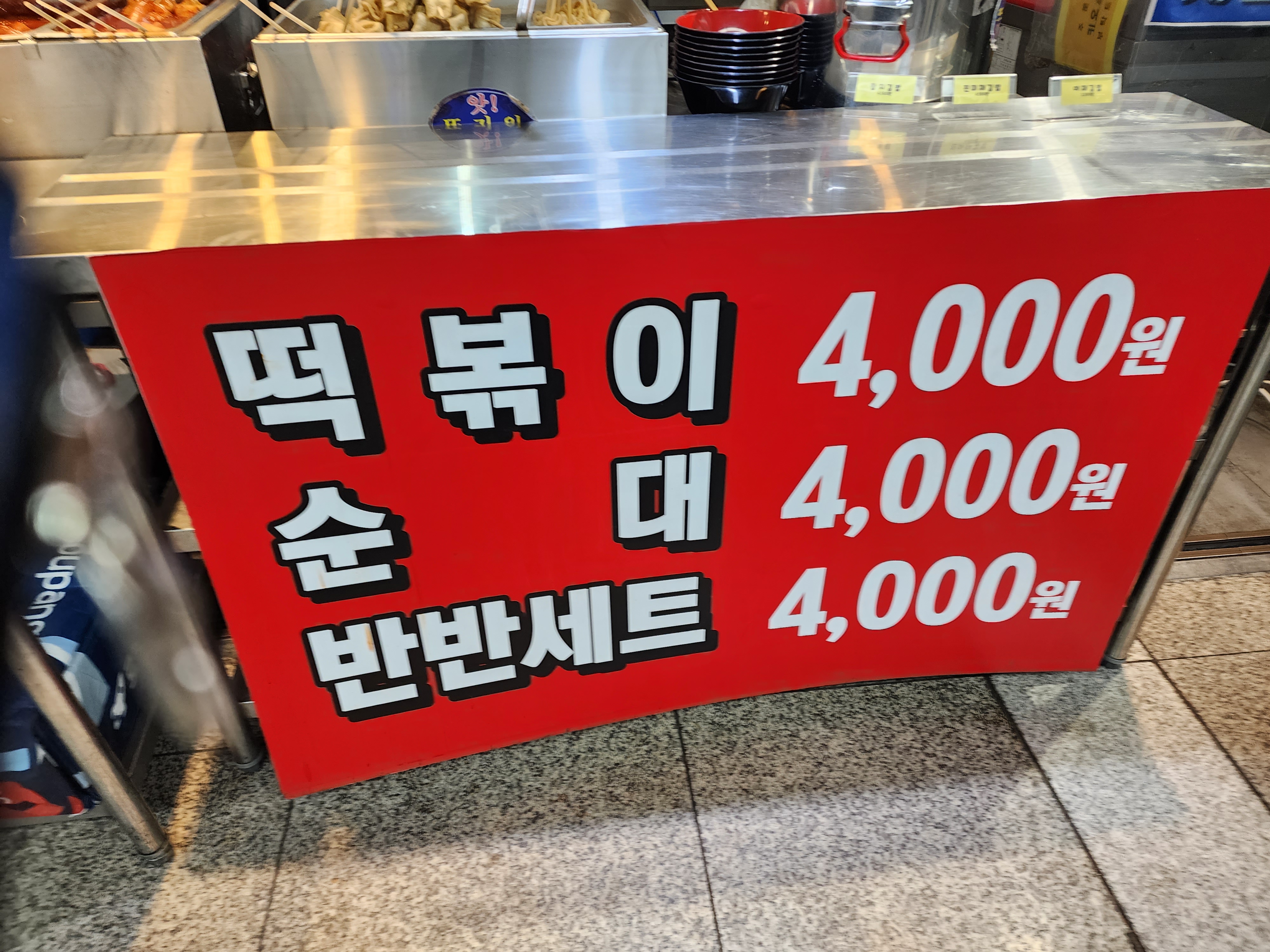 떡볶이 4천원,4천 원, 순대 4천 원, 반반세트에는 떡볶이와 순대가 반반 들어가요.