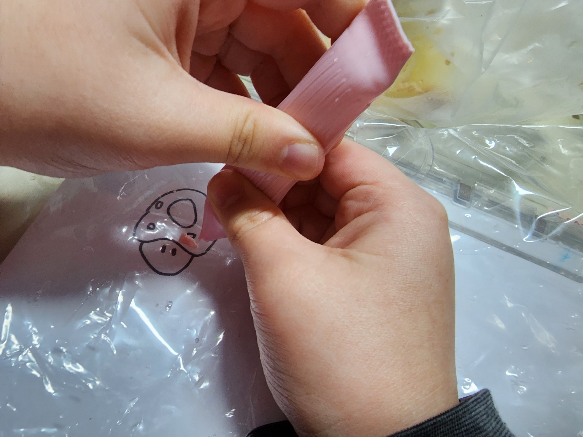 검정색은 참크래커에 물음표를 그려 주고, 핑크와 화이트 그리고 검정색을 이용 해 버섯 하나를 만들어 냉장고 (혹은 냉동실)에 굳혀줍니다.