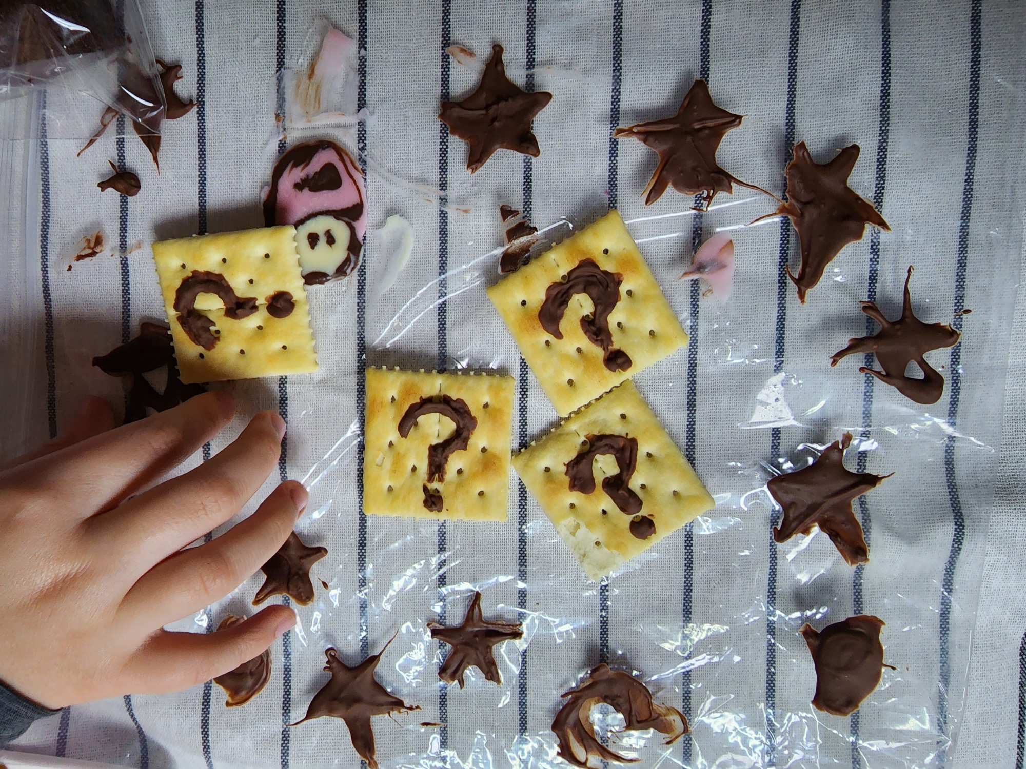 2. 아이비 크래커 4개에 초코펜으로 물음표를 그려 버섯과 함께 굳혀줍니다. 저는 초코 별을 만들어서 다른 디저트에 넣으려고 준비했습니다.