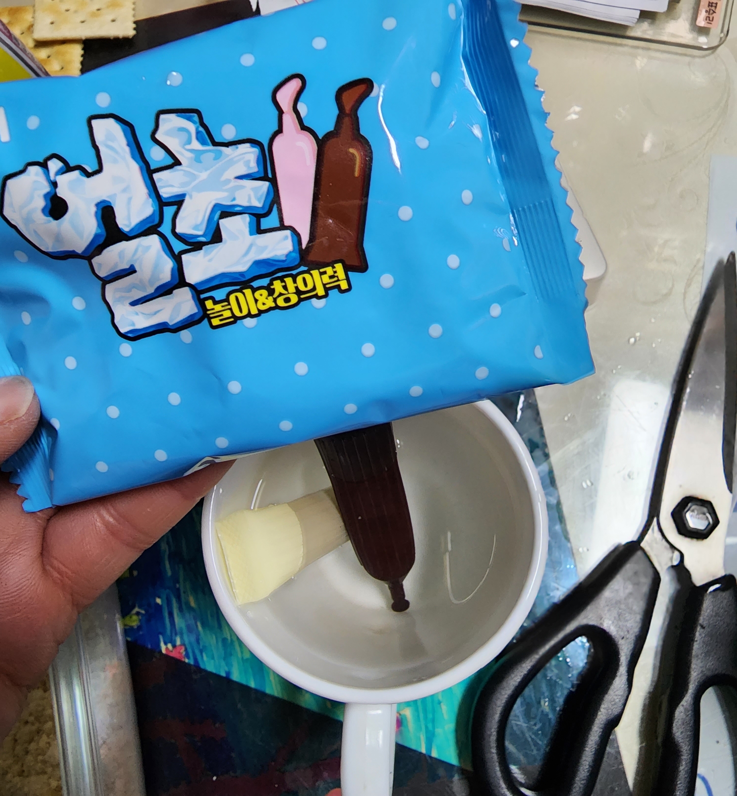 1. 먼저 얼초에 들어있는 초코펜을 따뜻한 물에 넣어 주세요. (초코펜이 말랑해지면 팁을 잘라서 이용합니다.)