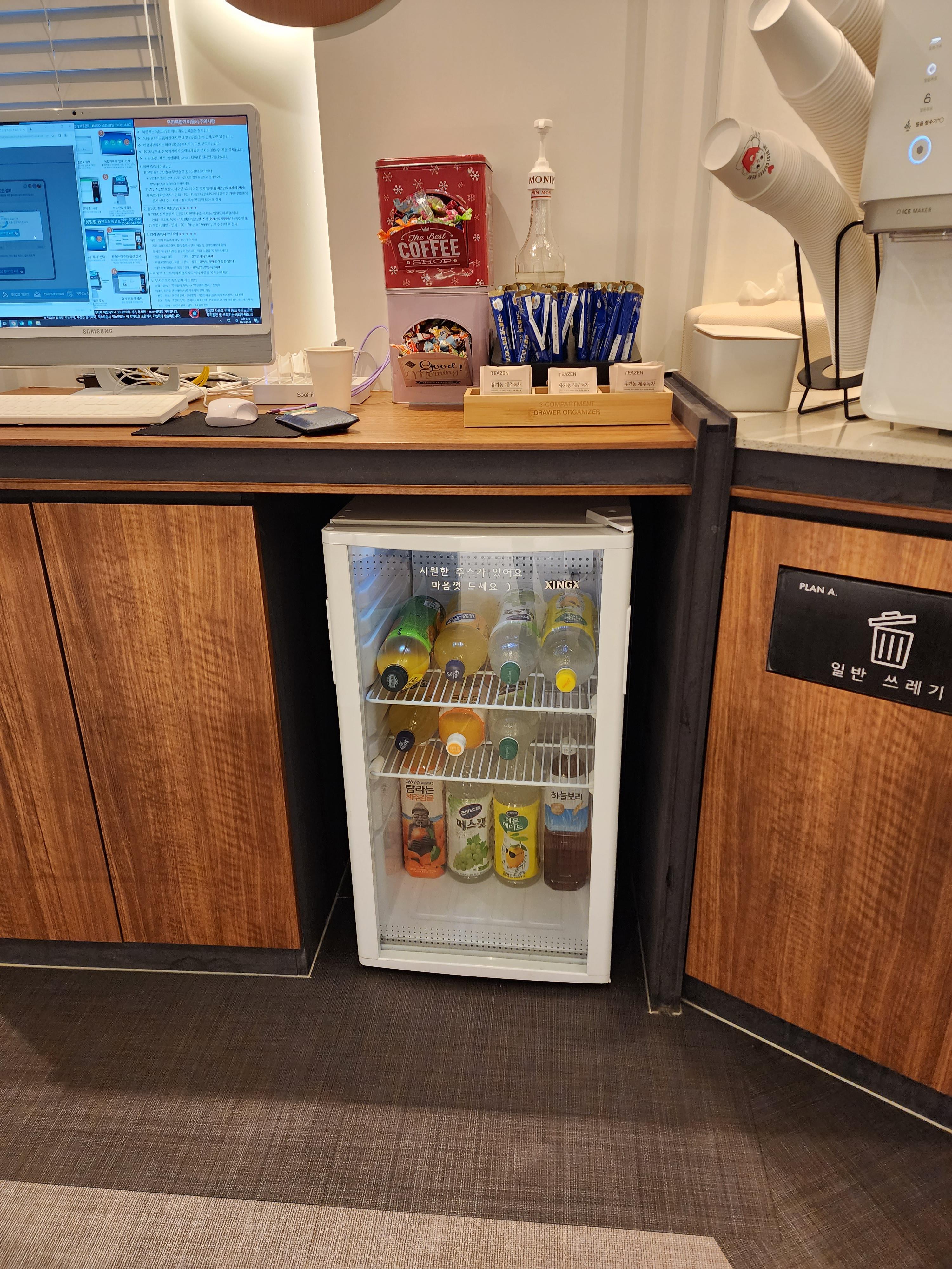 플랜에이 스터디카페는 금액을 추가해 스터디룸을 사용할 수도 있고, 와이파이와 카페이용이 무료랍니다. 카페에는 얼음도 따로 마련되어 있고, 간단한 음료도 냉장고 안에 들어있습니다. 커피머신도 있고 1회용 커피 (이디야)도 있었습니다.