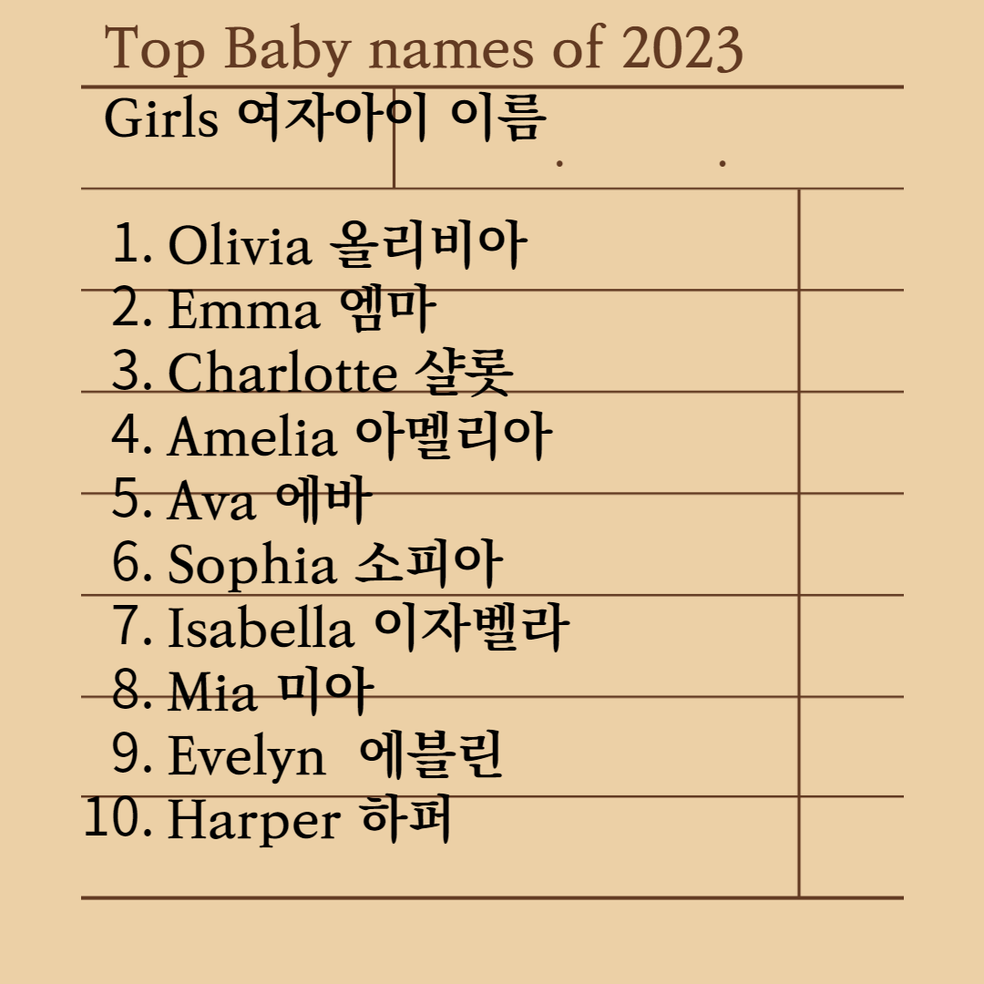 | 1 | Olivia | 올리비아 | Latin | olive tree 올리브나무는 그리스 신화에서 평화의 상징 |