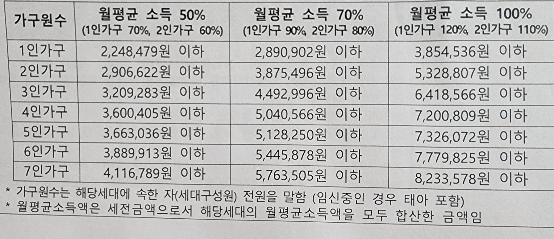 월평균소득 50% (1인 90%, 2인 80% 이하)