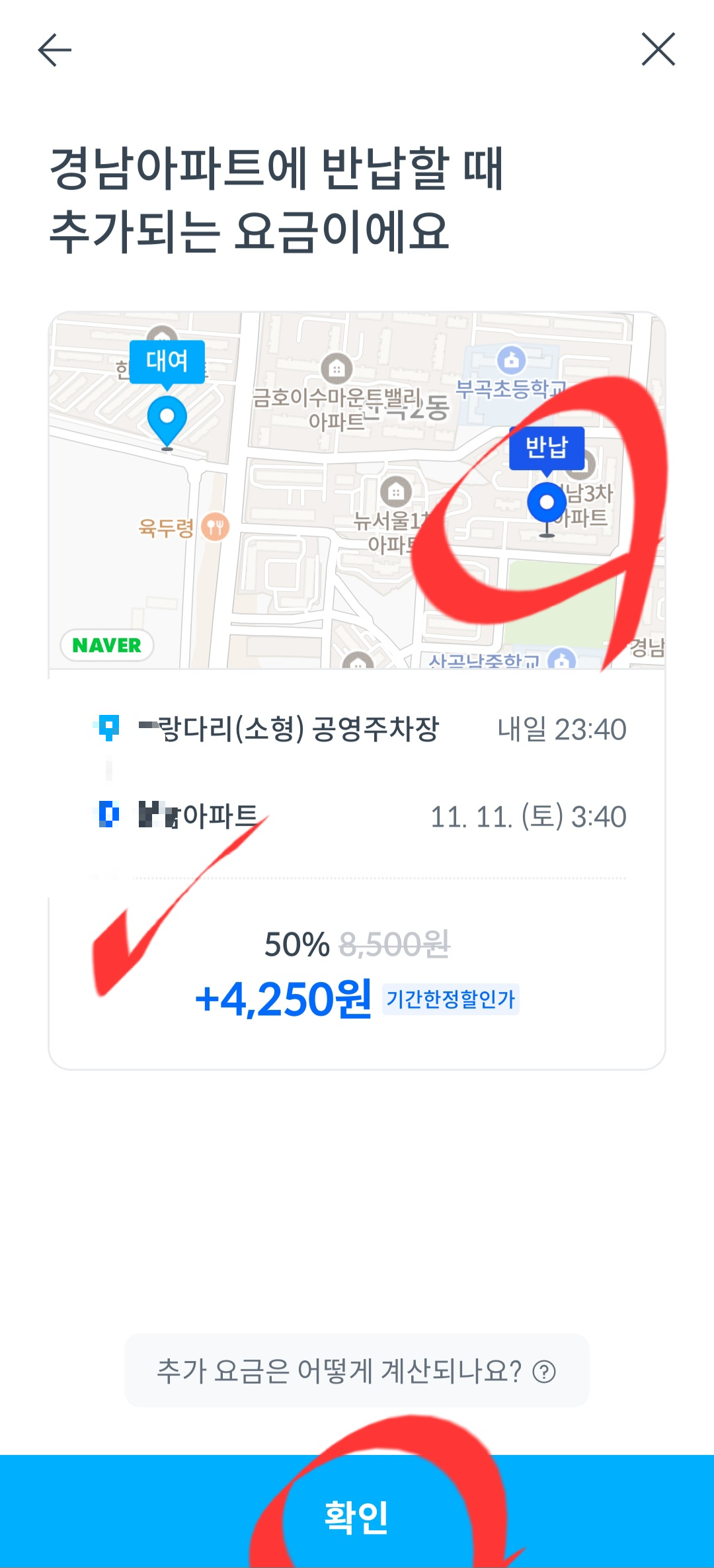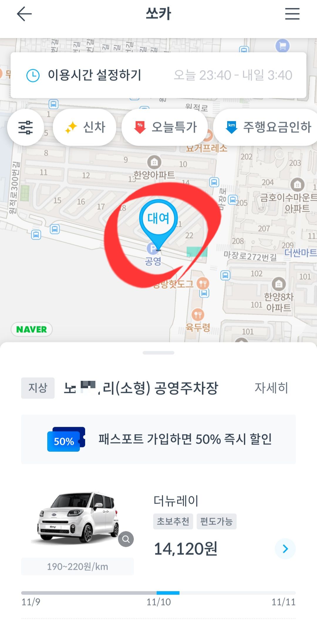 - 실제로 반납 할 곳을 클릭 해 본다. (꿀팁: 공영주차장이나 쏘카존에서만 반납이 되는 줄 알았는데 아파트 주차장에서도 가능합니다. 오히려 가격이 더 저렴한 곳도 있음_저의 경우 가까운 쏘카존은 할인가 5천원, 엄마네 아파트는 할인가 5천얼마였습니다. 실제로 내리는 곳이 더 저렴할 수 있으니 클릭해 보시기 바랍니다.)