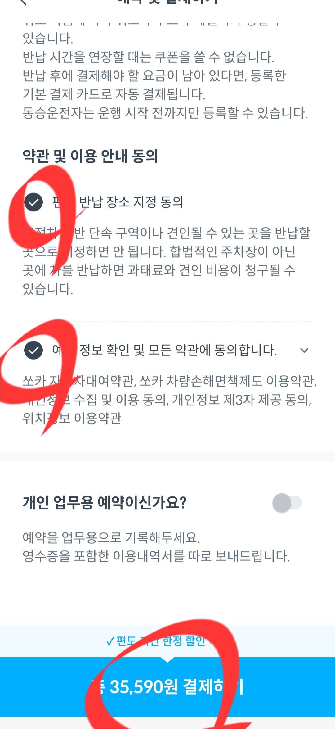 - 렌트 할 내용 확인 체크 후 약관및 이용 안내에 동의한다.