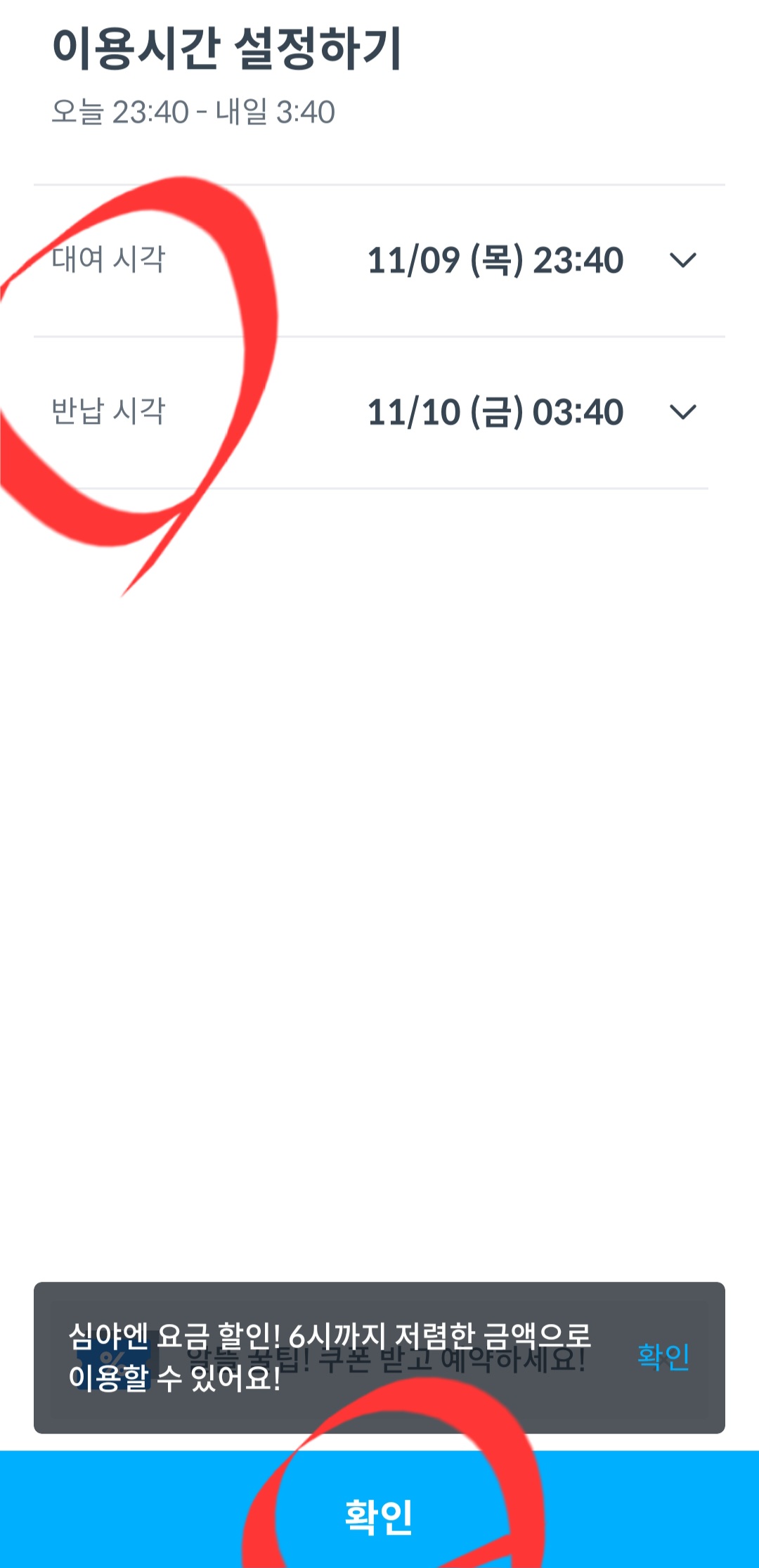- 대여 버튼을 누르고, 사용시간을 설정한다. (대여시각, 반납시각 입력) → 확인