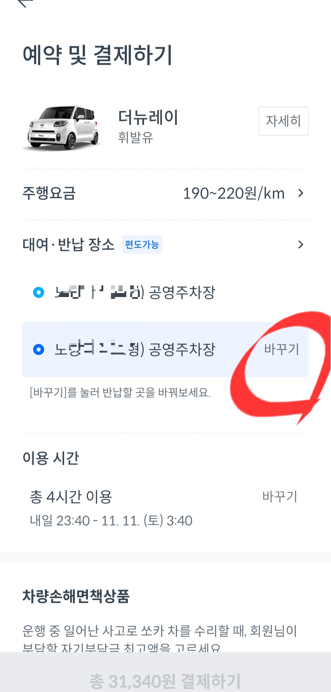 - 편도로 이용시, 반납장소 바꾸기를 누른다. (같은 곳에서 반납을 원하면 편도 처리가 되지 않습니다.)