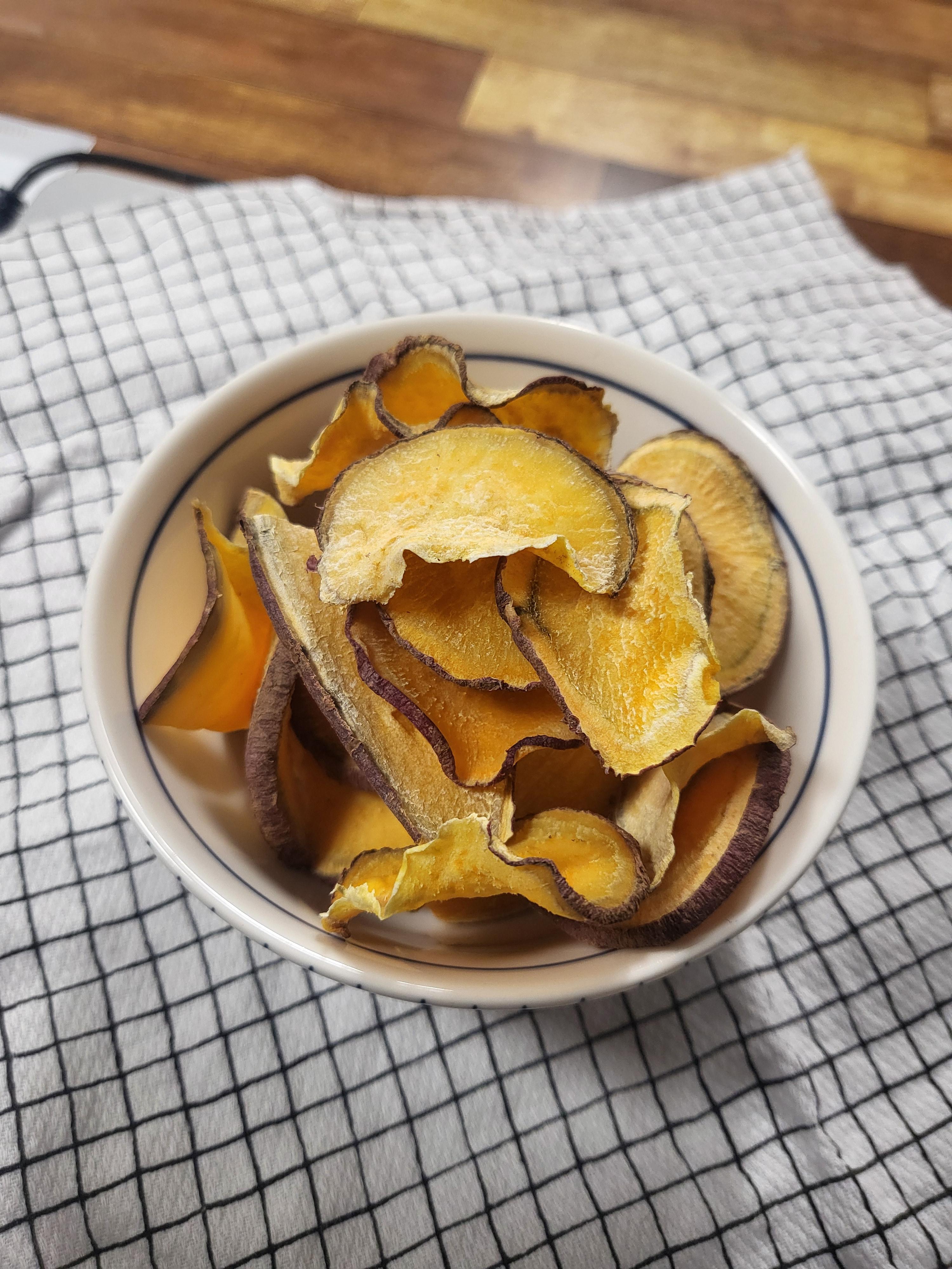 고구마 칩이 눅눅해 졌을 때는 오븐이나 에어프라이어에 5분정도 다시 데워주면 (160도정도) 다시 바삭해 집니다.