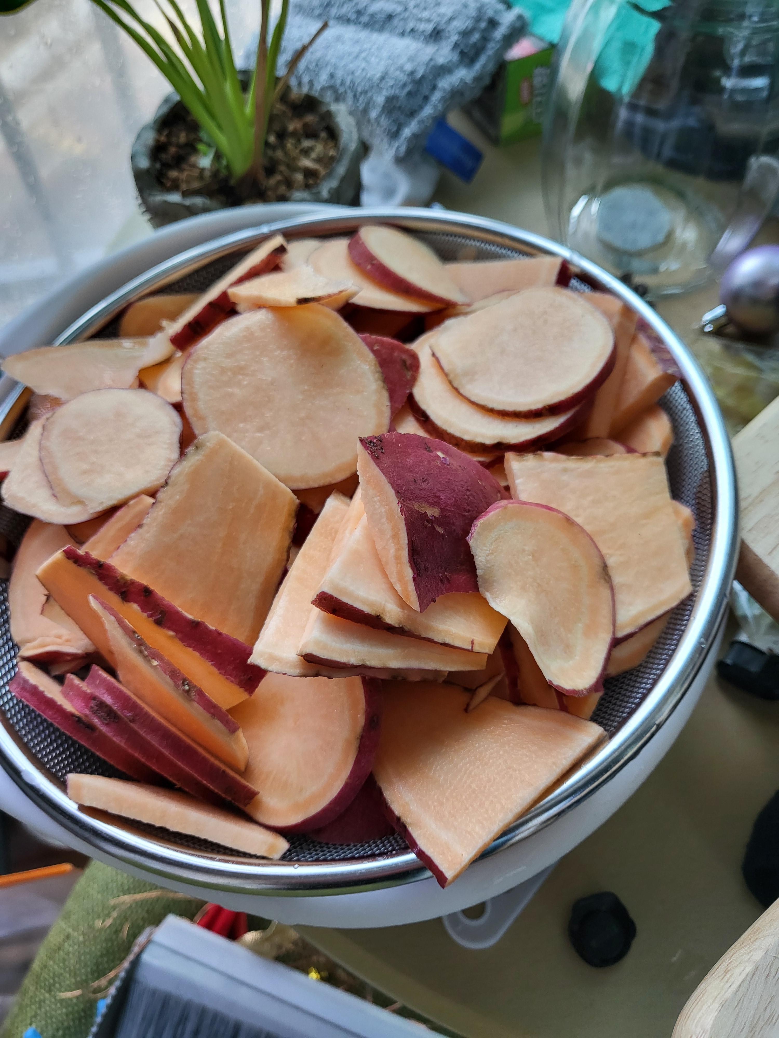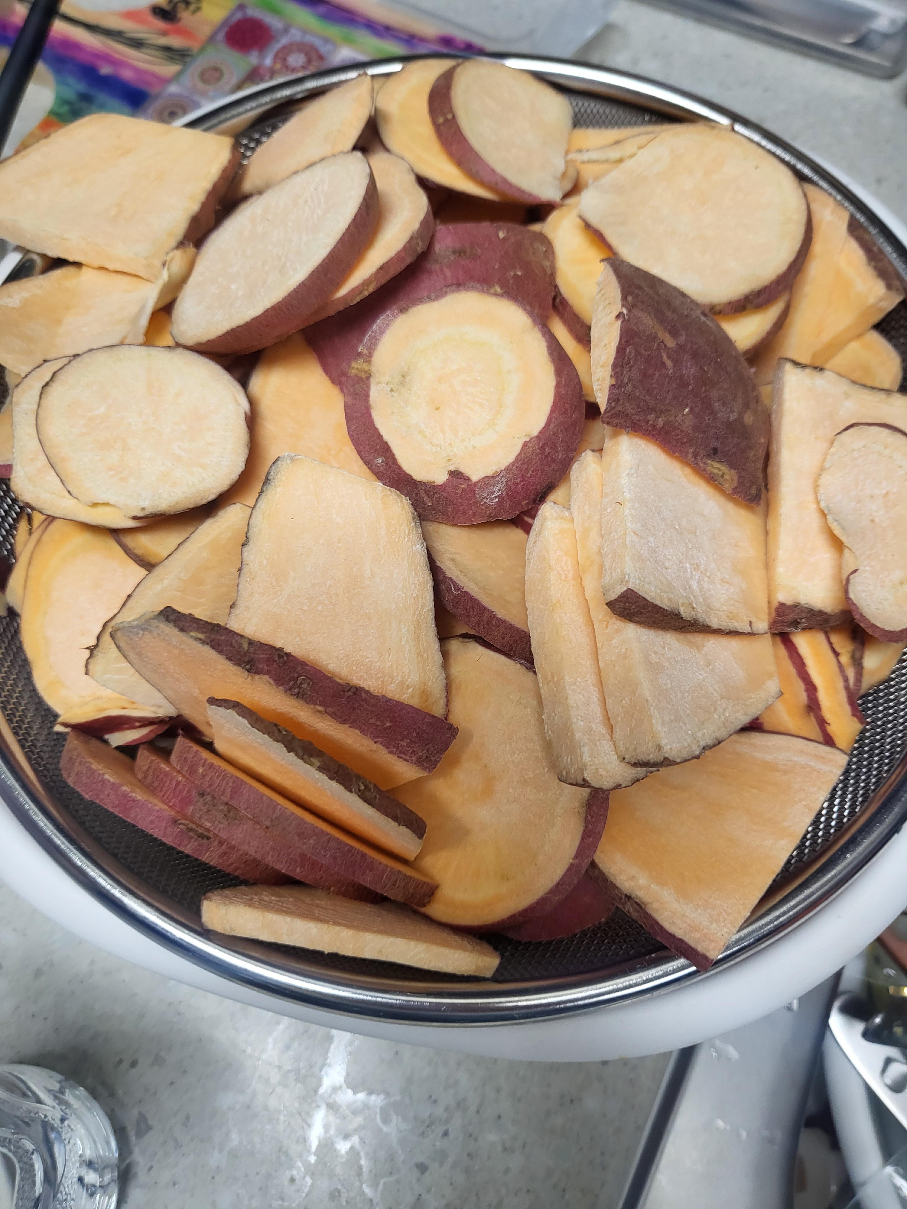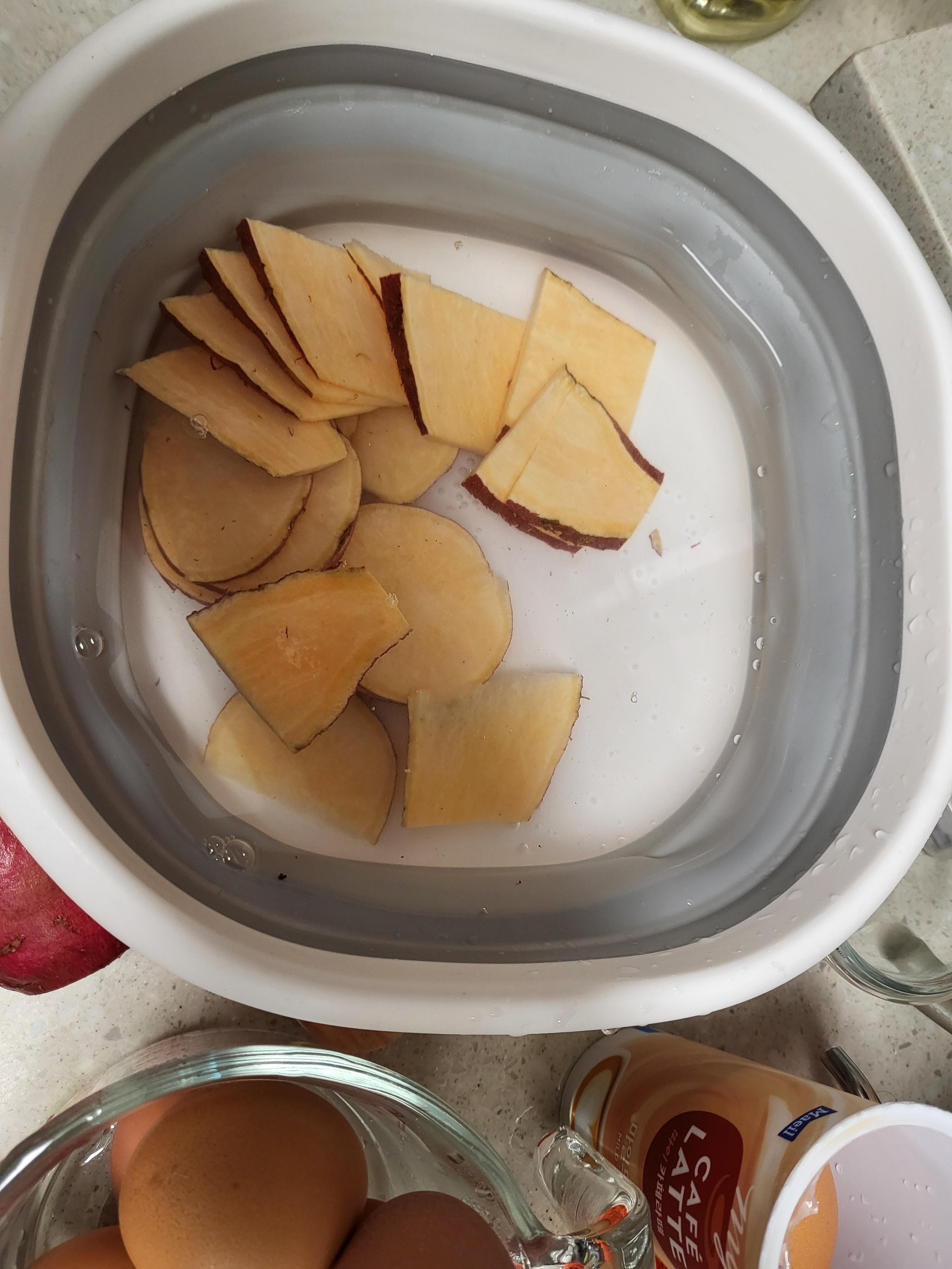 - 고구마를 껍질째 얇게 썰어줍니다.