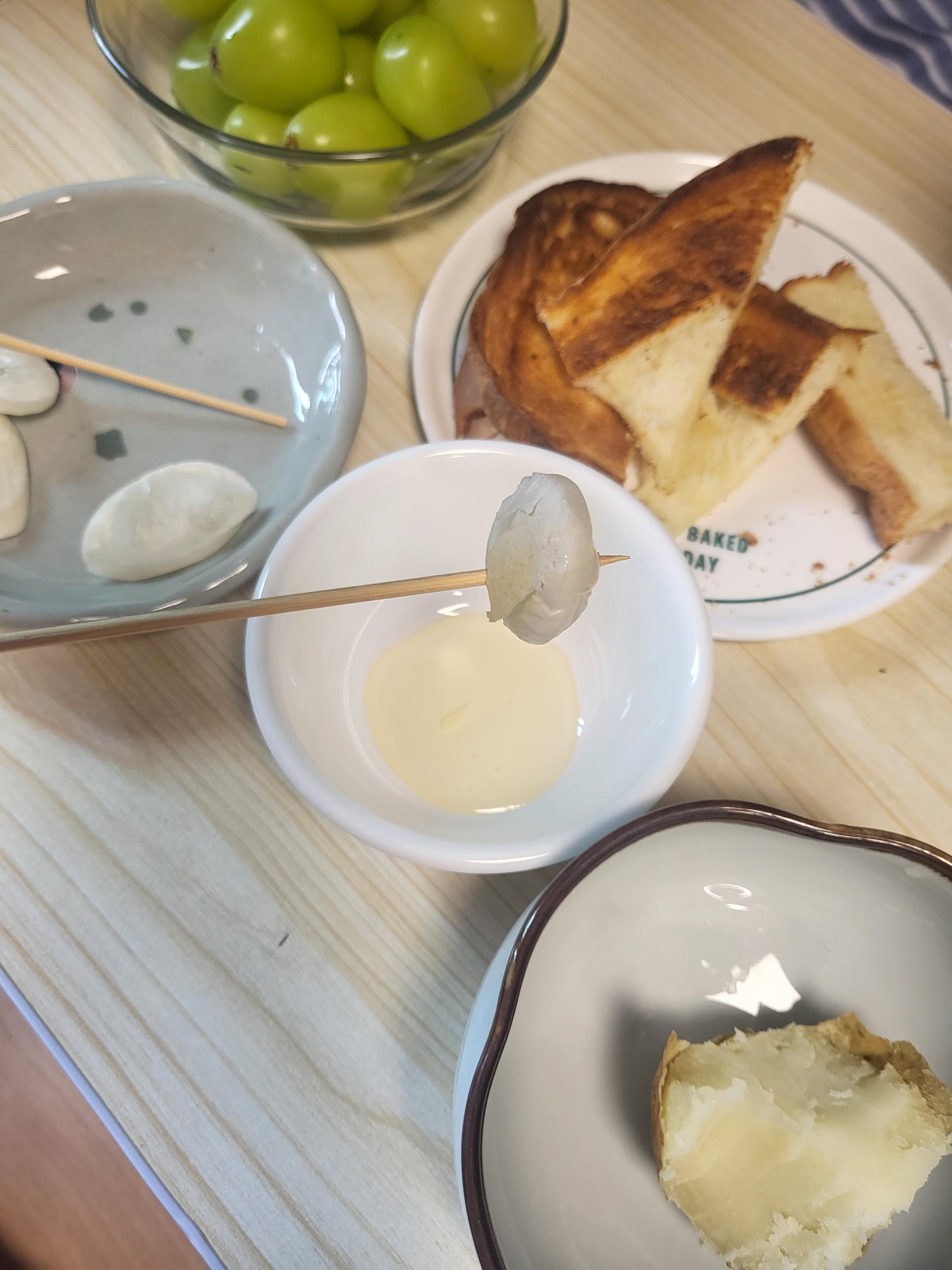 - 겉바속촉 쫀득하고 바삭한 가래떡을 달짝지근한 꿀에 찍어 먹습니다.
