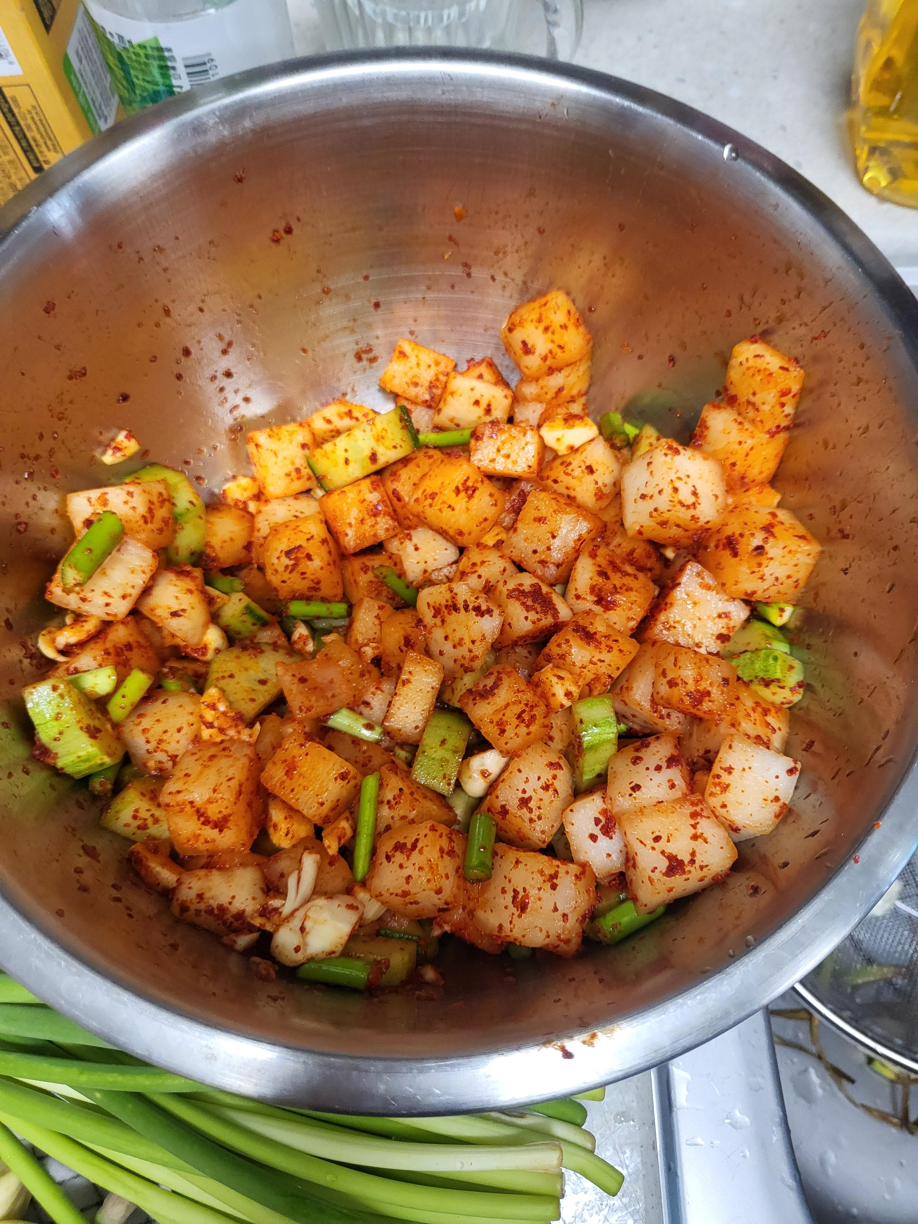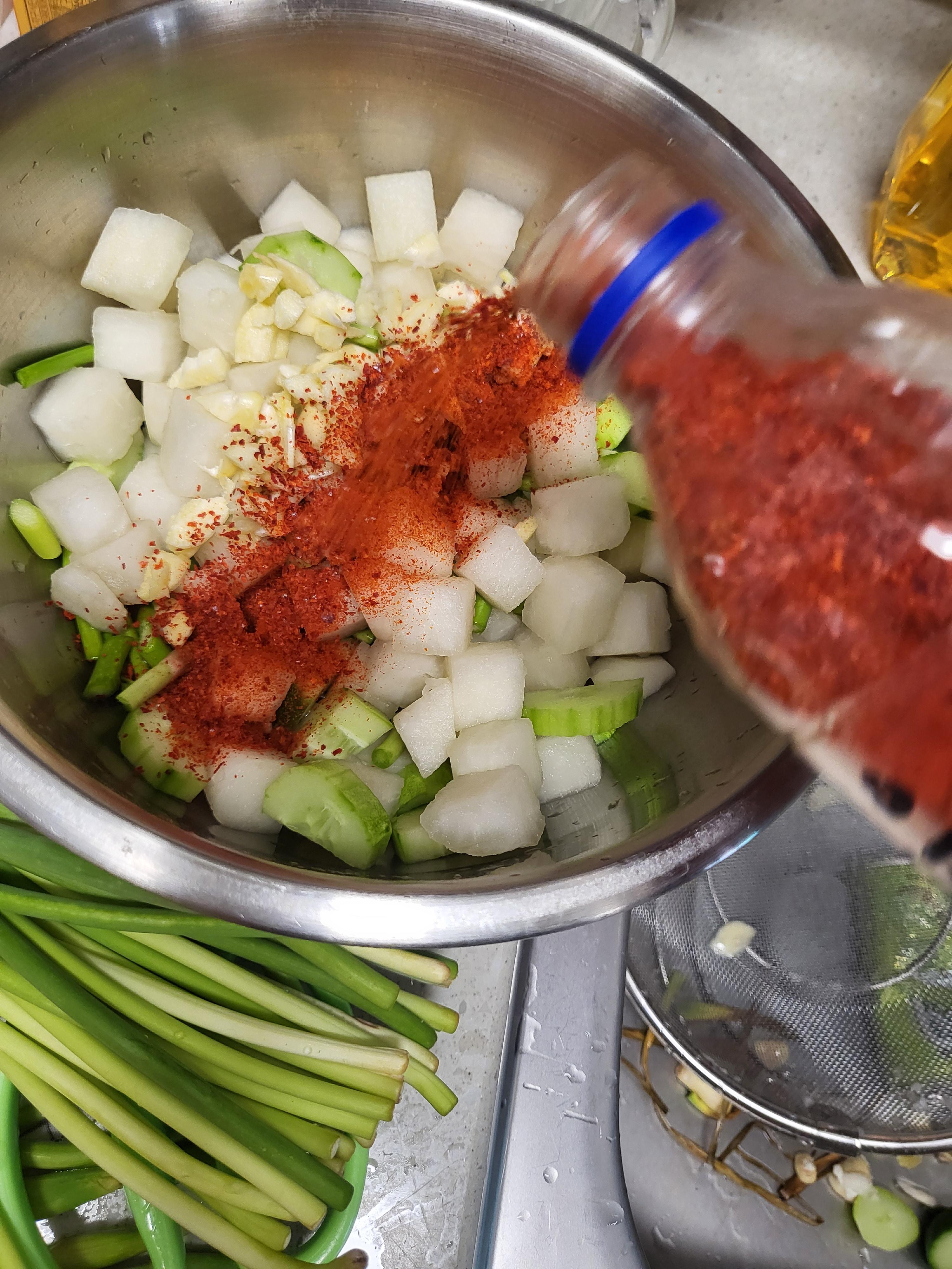 - 물기를 뺀 치킨무에 고춧가루를 살살 뿌려줍니다.