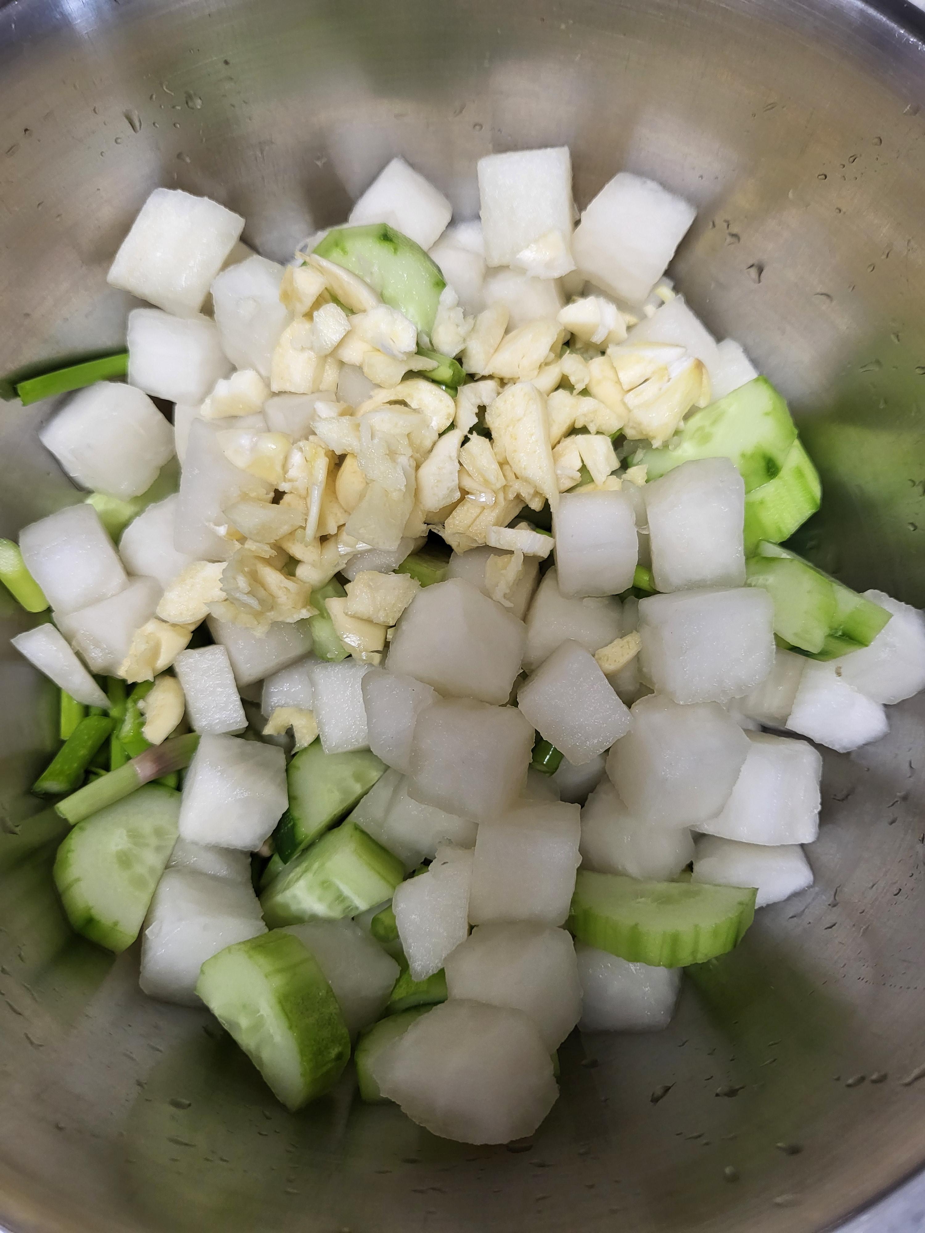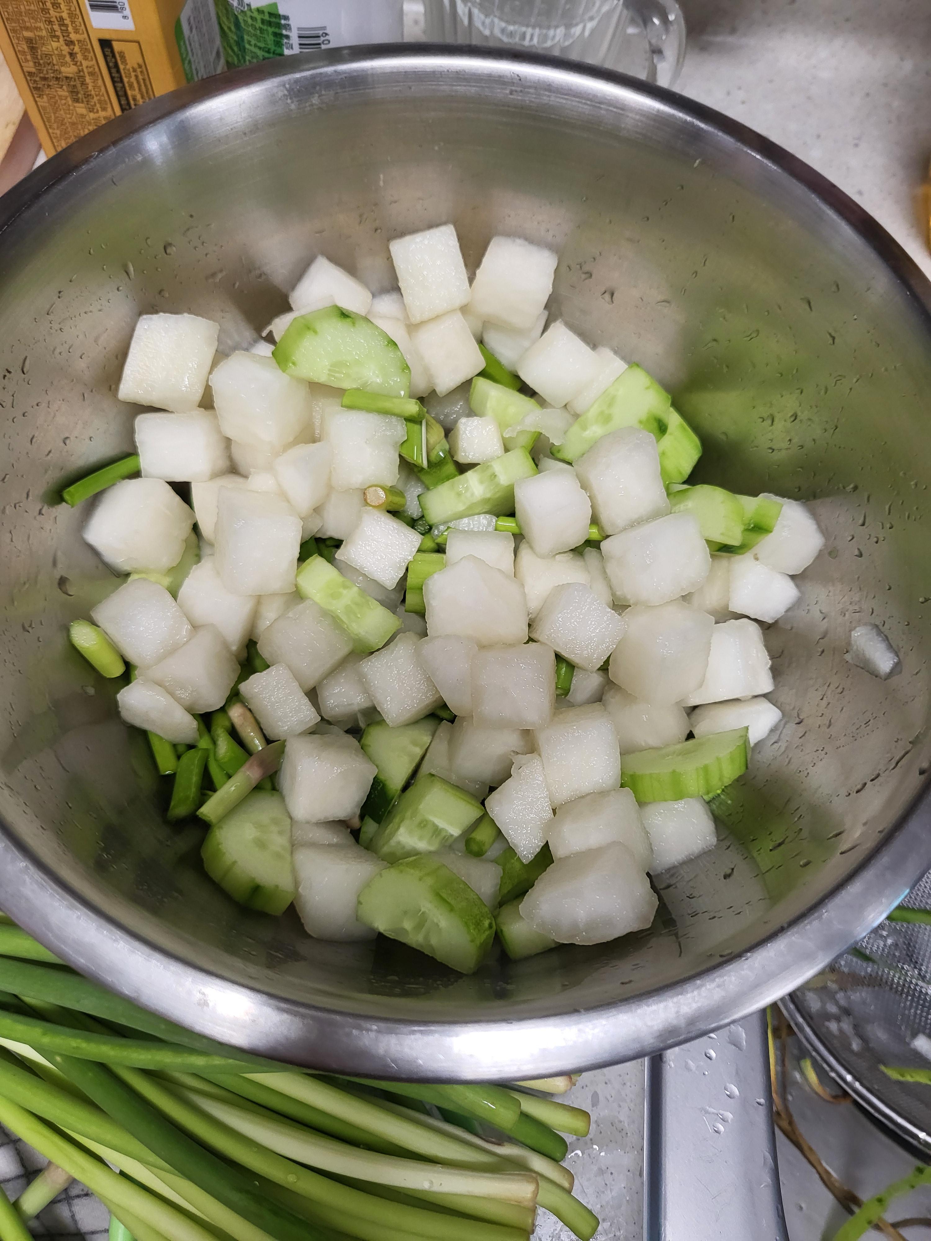 - 치킨무를 포장 벗겨 찬물에 씻어 물기를 빼준다. (집에 남는 오이가 있으면 함께 썰어 넣어 줍니다.)