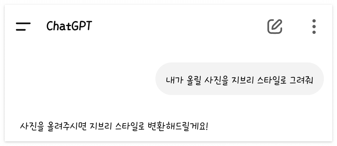 Chat GPT 창에 사진을 올리고, 지브리 스타일로 그려달라고 명령하면, 몇 분 후 지브리 스타일로 사진이 생성됩니다.