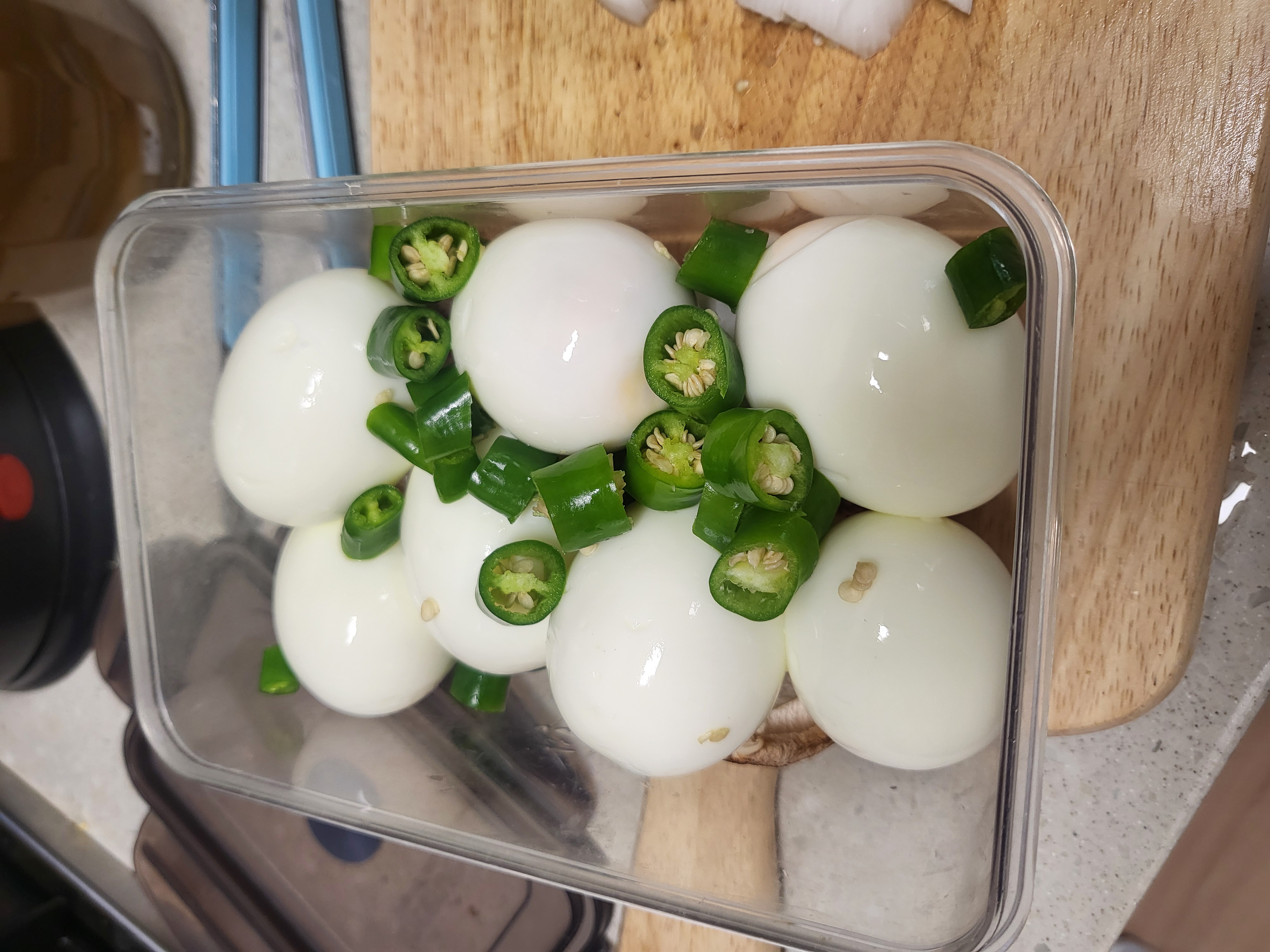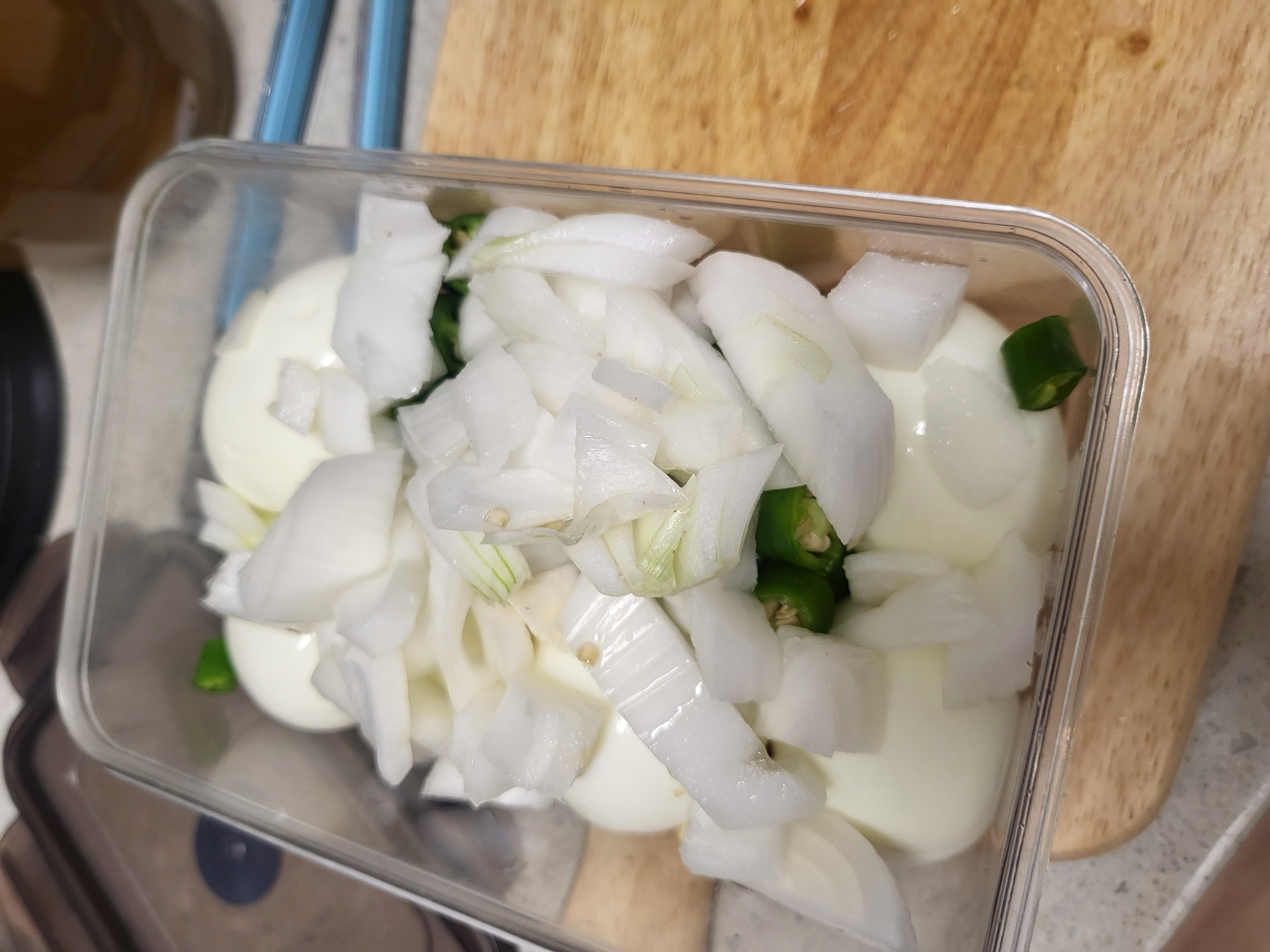 - 삶은 계란을 넣고 그 위 생 청양고추와 양파를 넣어줍니다. (아삭하게 먹을 수 있습니다.)