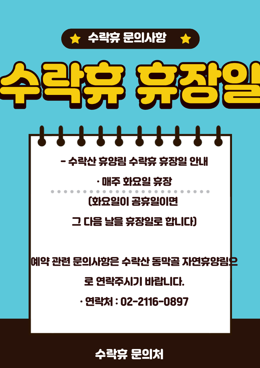 수락휴 예약 관련 문의사항은 수락산 동막골 자연휴양림으로 연락주시기 바랍니다.