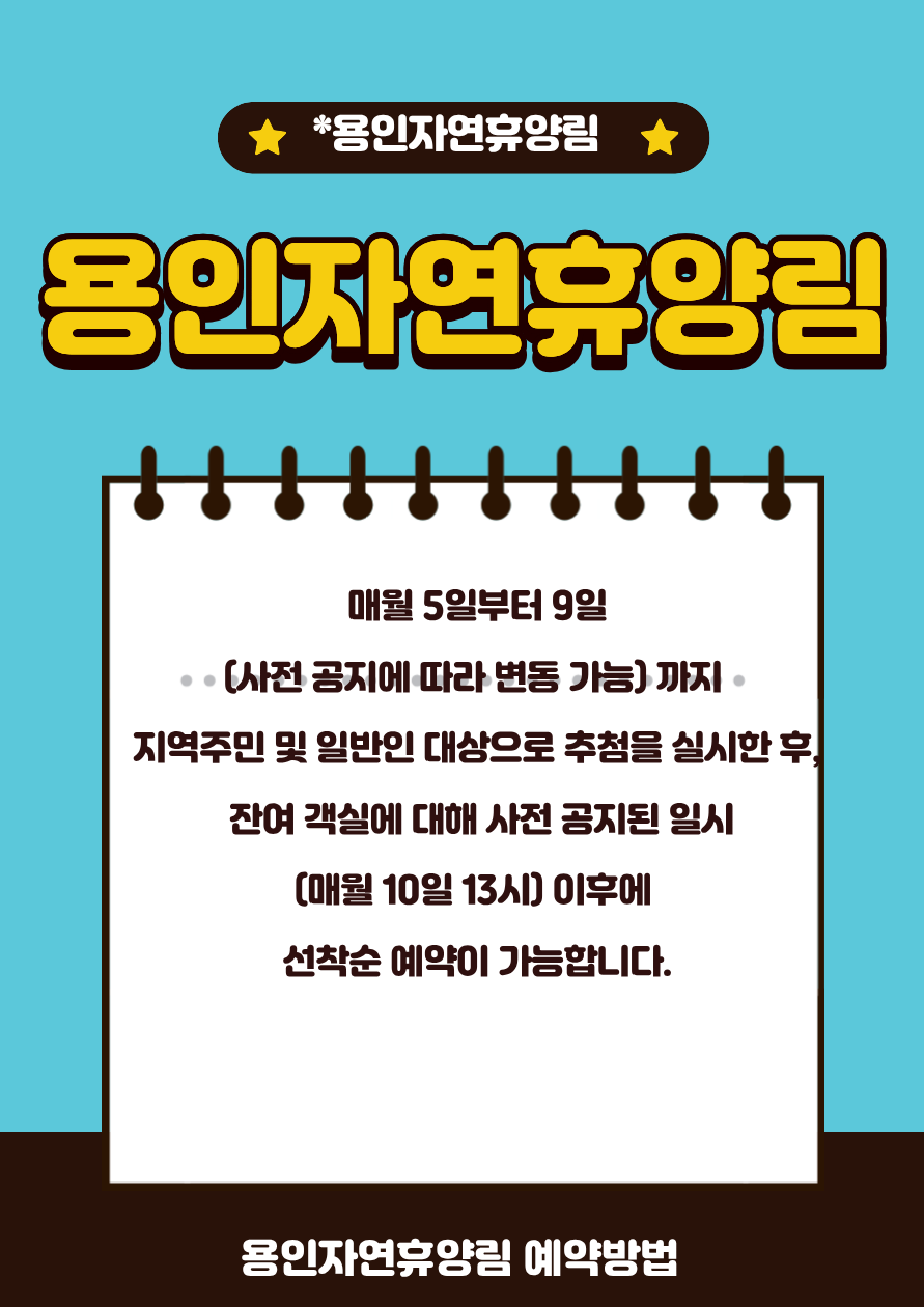 용인자연휴양림은 매월 5일부터 9일(사전 공지에 따라 변동 가능) 까지 지역주민 및 일반인 대상으로 추첨을 실시한 후, 잔여 객실에 대해 사전 공지된 일시(매월 10일 13시) 이후에 선착순 예약이 가능합니다.